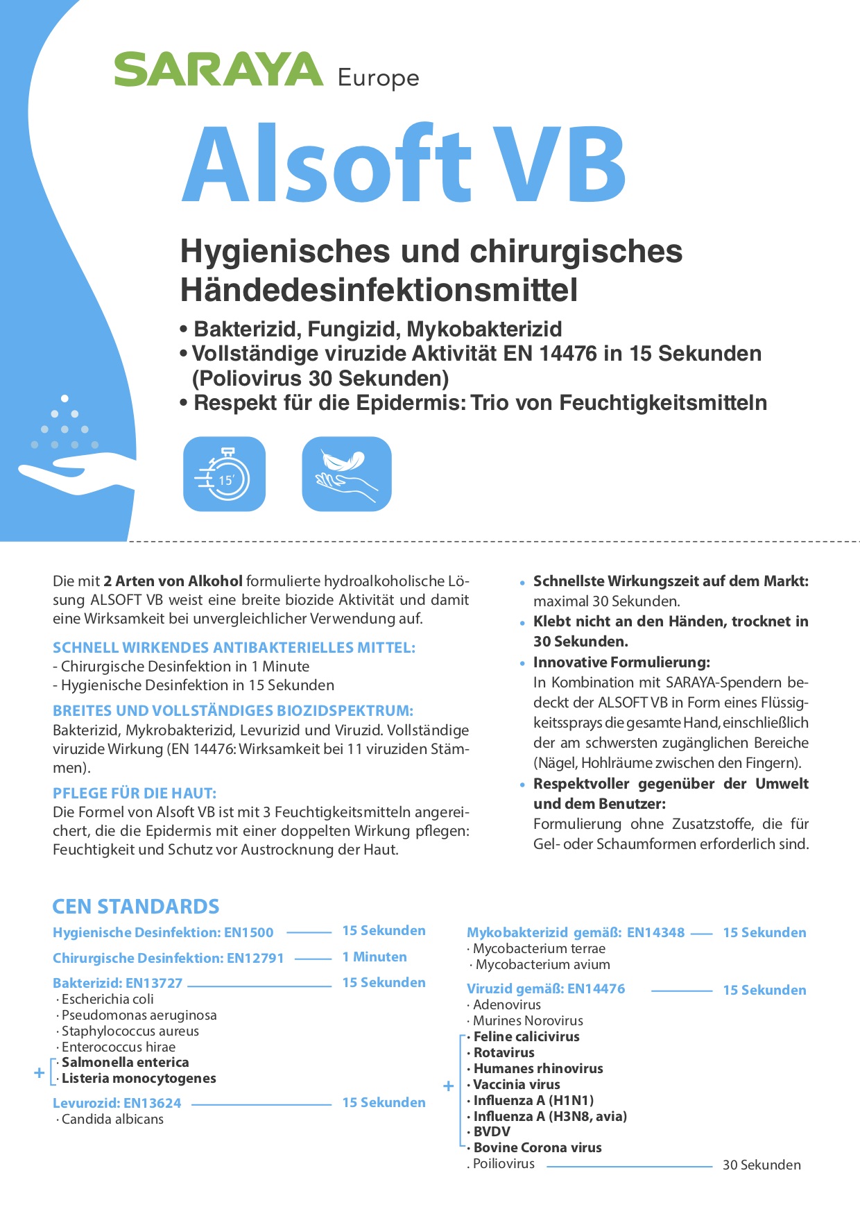 Die mit 2 Arten von Alkohol formulierte hydroalkoholische Lösung ALSOFT VB weist eine breite biozide Aktivität und damit eine Wirksamkeit bei unvergleichlicher Verwendung auf.